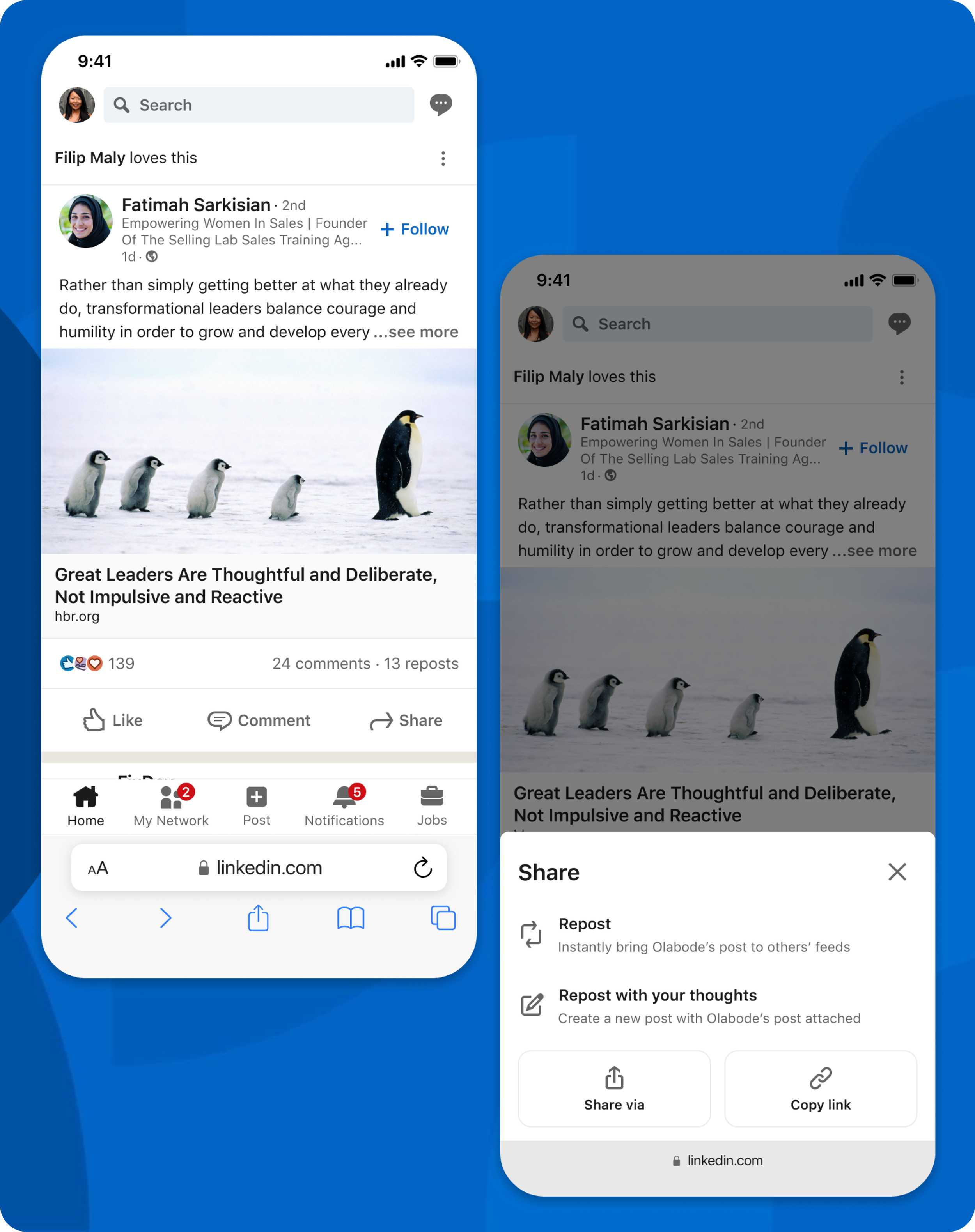 We introduced a bottom sheet that consolidated and simplified the different ways in which members can share content, including the option to instantly repost. We also added a repost count to posts, with the goal of using social proof to encourage and educate members about reposting.